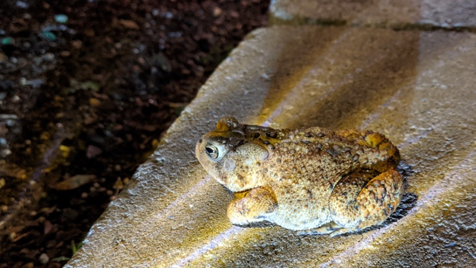 The toads are still around and seem to be doing well. They hide during the day, but I routinely see up to five of them at night, especially if it’s rained recently. I just need to watch where I step because they sometimes sit in the middle of the sidewalk.